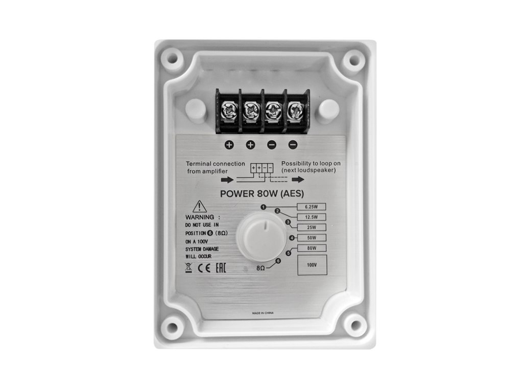 Dvojpásmová reproskrinka s 8" basovým a 1" výškovým reprodutorom s uchytením na stenu. Vyrobená je z ABS materiálu bielej farby s hliníkovou krycou mriežkou. Reproduktor je vhodný na ozvučenie, vonkajších ako aj vnútorných priestorov, ako napr. vonkajších terás, športových priestorov, námestí, reštaurácií, domov smútku a pod.. Na zadnej strane je otočný prepínač príkonu pre voľbu 100 V / 6,25; 12,5; 25; 50; 80 W alebo nízkoimpedančného zapojenia 8 Ohm (80 W).