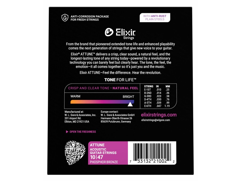 Sada Elixir Attune Extra Light (.010–.047) je určená pre akustických gitaristov, ktorí chcú prirodzený pocit a odozvu nepotiahnutých strún, no zároveň výnimočne dlhú životnosť tónu. Toto konkrétne hrúbkové prevedenie ponúka vyvážený kompromis medzi pohodlím pri hre a plným, bohatým zvukom – prináša čisté, zreteľné výšky, kontrolované basy a celkovo vyrovnaný charakter. Pokročilý povlak Attune je na dotyk prakticky nepostrehnuteľný, no účinne chráni struny pred koróziou a nečistotami, vďaka čomu si tón zachováva sviežosť oveľa dlhšie.