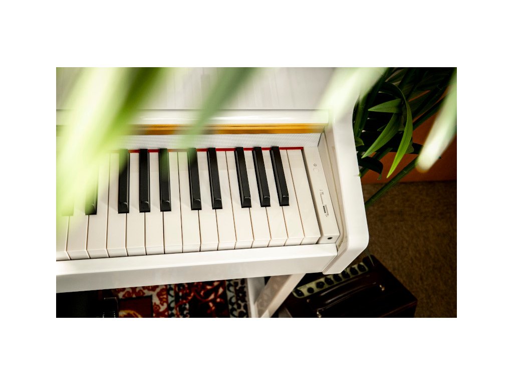 Vstavané reproduktory 2x 20W a 128 hlasá polyfónia zaisťujú plný a presvedčivý zvuk, či už pri hre potichu doma alebo pred publikom v menšom priestore. Vďaka špeciálnym priezorom nad klaviatúrou je zvuk priestorovejší. Slúchadlový výstup (jack 3,5 mm) umožňuje večerný tréning bez rušenia okolia. Tri pedále – Soft, Sostenuto a Sustain – fungujú rovnako ako pri akustickom klavíri a umožňujú detailnú prácu s výrazom. Bluetooth (MIDI & Audio) slúži na pripojenie k výukovým aplikáciám alebo prehrávanie obľúbených skladieb. Konektivita ďalej zahŕňa USB to Hosť, MIDI In/Out a Audio In/Out. Bytelná skriňa s lesklým čiernym povrchom pripomína tradičné akustické piana a zároveň pôsobí ako elegantný kus nábytku.