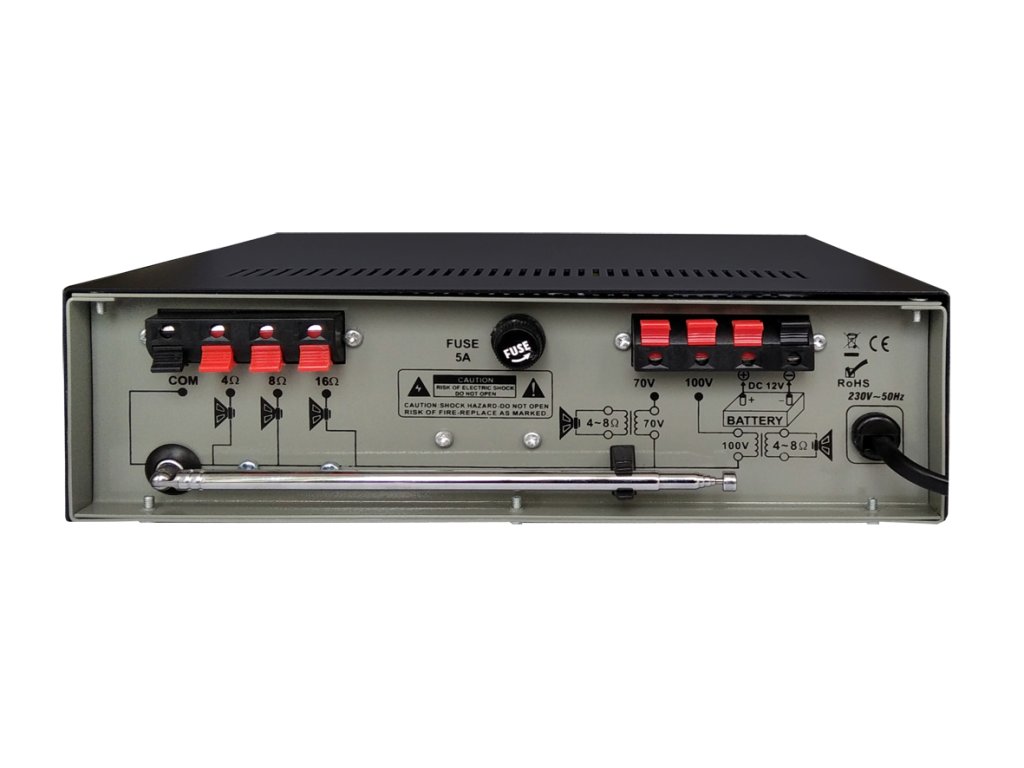 • Vstupy: 2 x MIC (Jack 6,3 mm), 1 x AUX IN (Jack 6,3 mm), konektory pre pripojenie USB kľúča a SD pamäťovej karty, AM-FM konektor pre pripojenie externej antény. Súčasťou balenia je teleskopická anténa s AM-FM konektorom,