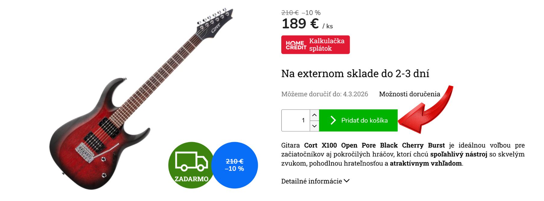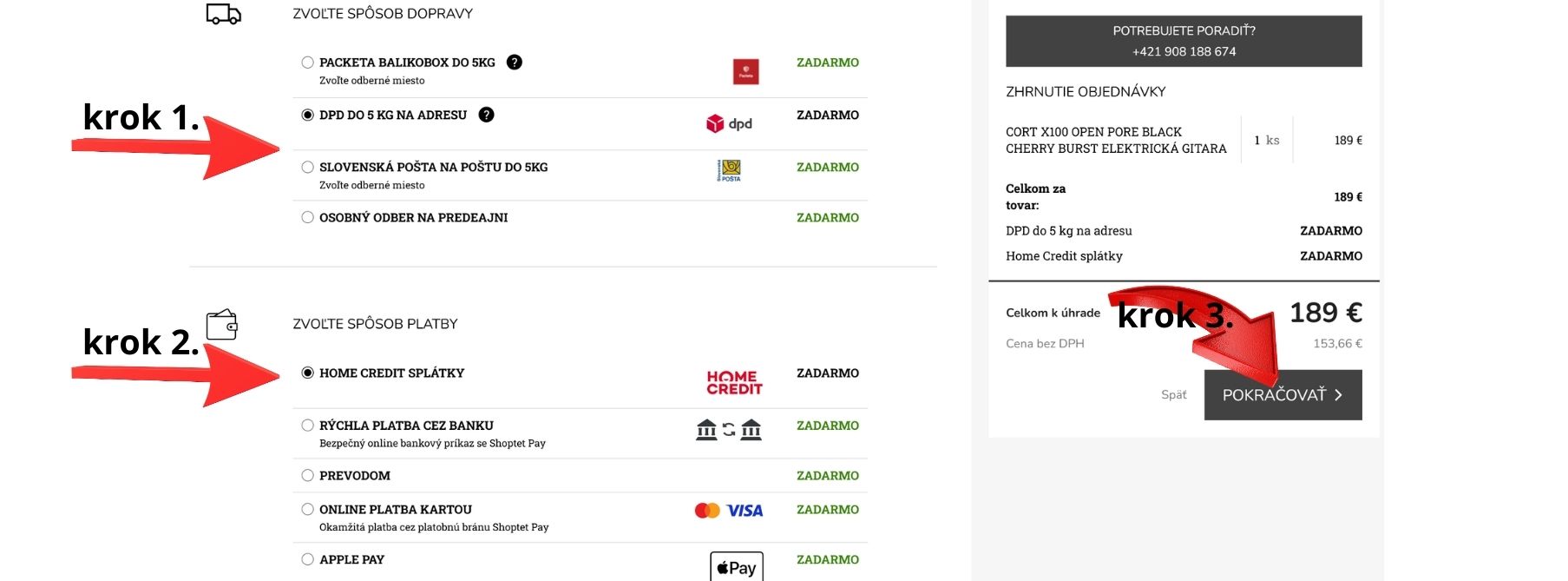 4. Zvoľte si : 1.spôsob dopravy, 2. spôsob platby – HOME CREDIT SPLÁTKY a 3. POKRAČOVAŤ