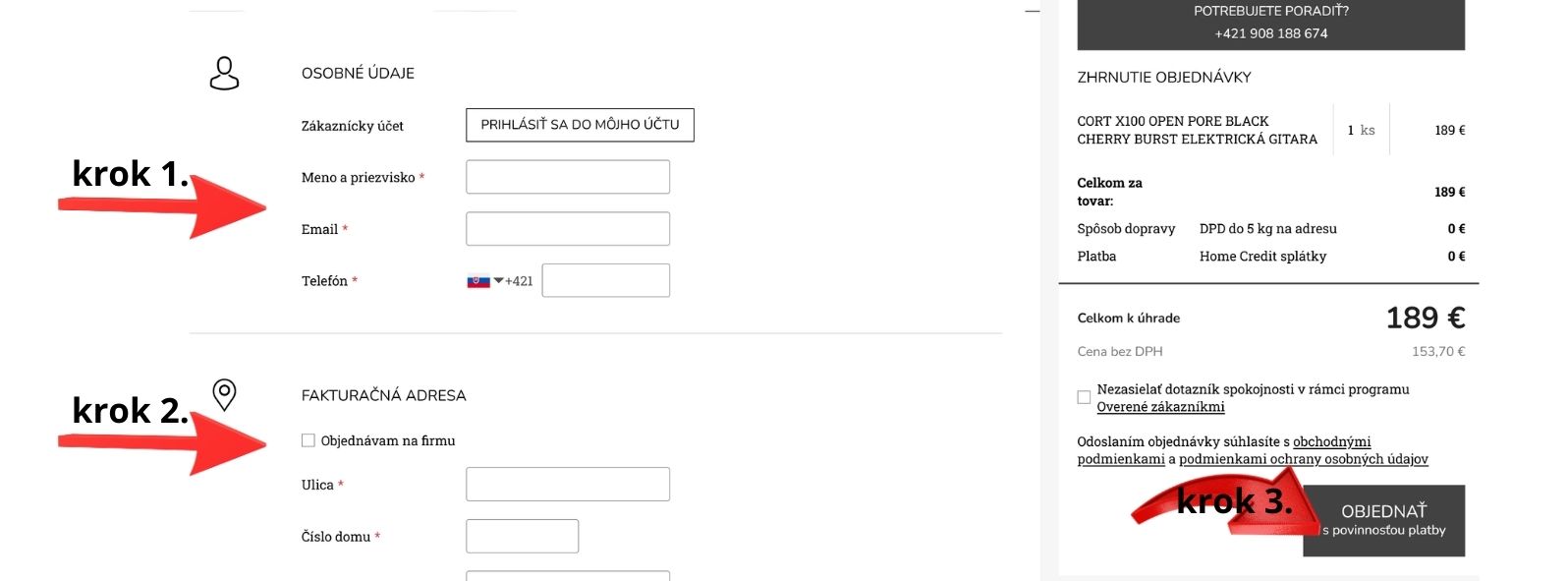 5. Vyplňte si: 1. OSOBNÉ ÚDAJE, 2.FAKTURAČNÚ ADRESU , 3. OBJEDNAŤ s povinnosťou platby