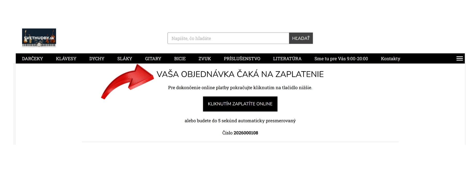 6. Dostanete sa na „VAŠA OBJEDNÁVKA ČAKÁ NA ZAPLATENIE“ . Počkajte cca 5 sekúnd a budete presmerovaný na formulár HOMECREDIT.